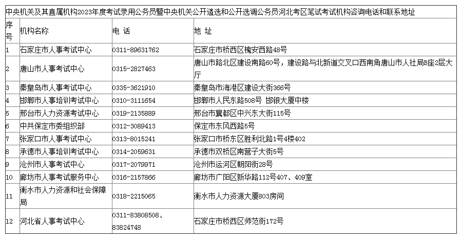 中央機關及其直屬機構2023年度考試錄用公務員暨中央機關公開遴選和公開選調公務員河北考區(qū)筆試考試機構咨詢電話和聯(lián)系地址