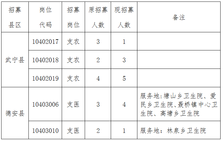 按照《2023年江西省高校畢業(yè)生“三支一扶”計劃招募公告》中“服務(wù)崗位的招募計劃數(shù)與報名人數(shù)不低于1:2的比例”的規(guī)定,結(jié)合2023年江西省“三支一扶”辦有關(guān)工作要求,凡服務(wù)崗位招募計劃數(shù)與報名人數(shù)低于1:2比例的,由設(shè)區(qū)市“三支一扶”辦根據(jù)考生報名情況調(diào)劑計劃。經(jīng)省“三支一扶”辦同意,現(xiàn)將相關(guān)招募崗位計劃調(diào)整如下: