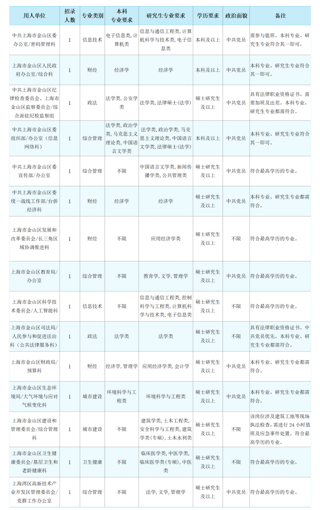 符合2024年上海市選調(diào)生招考公告中的高校范圍和基本條件(詳見下方報名網(wǎng)址),且所學專業(yè)及學歷等符合金山區(qū)招錄職位要求。