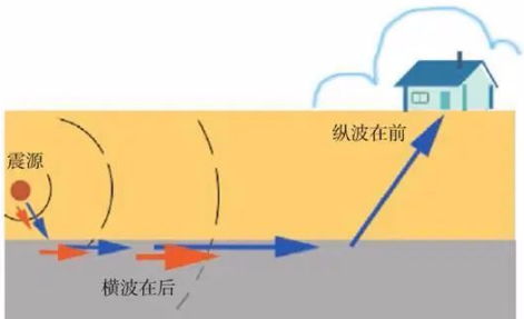 振動方向與傳播方向垂直的波為橫波(S波),其傳播速度為3.2--4km/S。來自地下的橫波能引起地面的水平晃動。所以地震發(fā)生時先上下顛簸,十幾秒后再左右晃動。