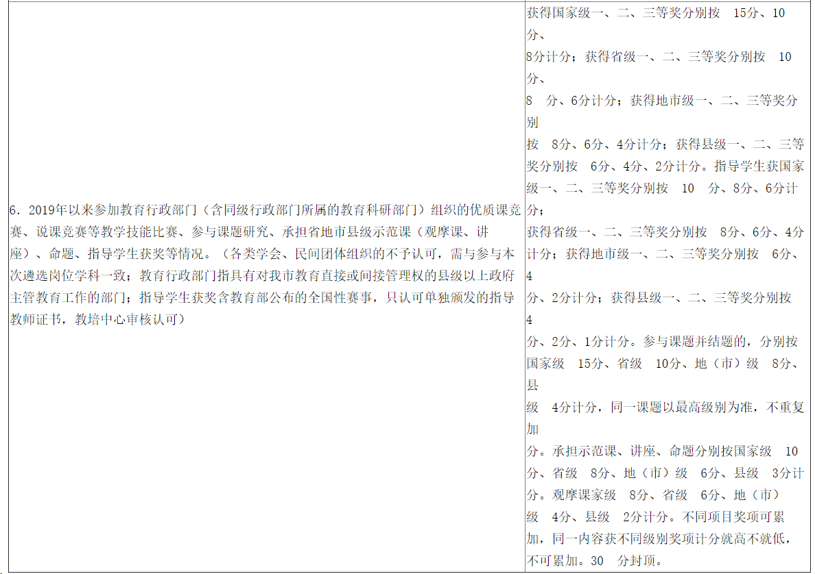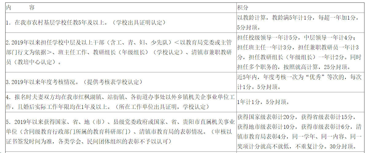 總分100分,具備下列條件的予以相應(yīng)計(jì)分,由清鎮(zhèn)市2024年面向二類(lèi)學(xué)校公開(kāi)遴選中小學(xué)、幼兒園教師工作領(lǐng)導(dǎo)小組對(duì)照參加遴選教師有關(guān)條件計(jì)算獎(jiǎng)勵(lì)性積分分值,獎(jiǎng)勵(lì)性積分按照40%計(jì)入個(gè)人遴選總成績(jī)。報(bào)名人員須在2024年4月9日20:00前將所有獎(jiǎng)勵(lì)性積分的相關(guān)印證資料提交清鎮(zhèn)市2024年面向二類(lèi)學(xué)校公開(kāi)遴選中小學(xué)、幼兒園教師工作領(lǐng)導(dǎo)小組辦公室審核,逾期不予受理。參加遴選教師積分情況將在清鎮(zhèn)市人民政府網(wǎng)上進(jìn)行公布(5個(gè)工作日)。