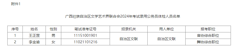 附件1:廣西壯族自治區(qū)文學(xué)藝術(shù)界聯(lián)合會2024年考試錄用公務(wù)員體檢人員名單