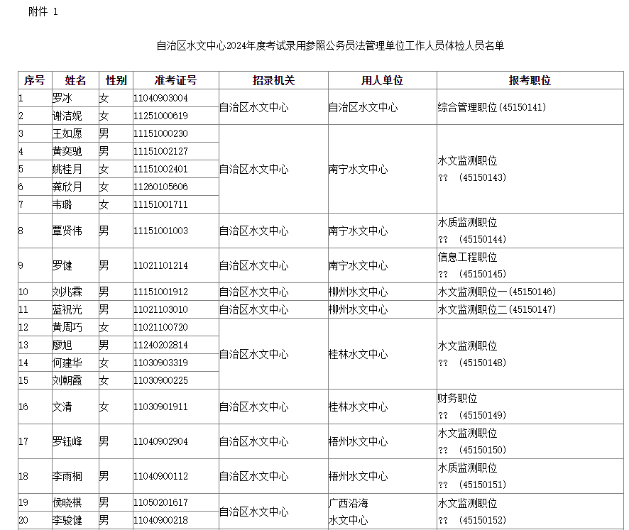 附件:1.自治區(qū)水文中心2024年度考試錄用參照公務員法管理單位工作人員體檢人員名單