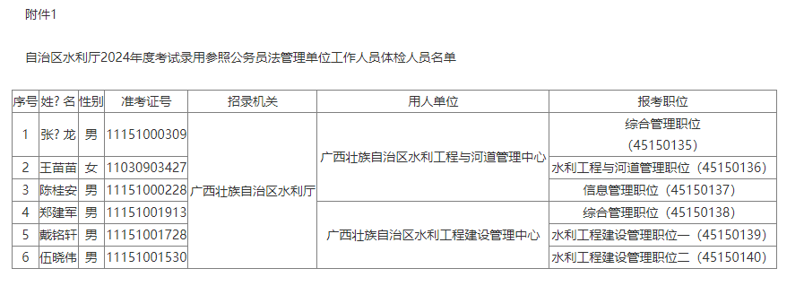 附件:1. 自治區(qū)水利廳2024年度考試錄用參照公務(wù)員法管理單位工作人員體檢人員名單