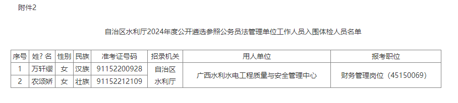 2. 自治區(qū)水利廳2024年度公開(kāi)遴選參照公務(wù)員法管理單位工作人員入圍體檢人員名單