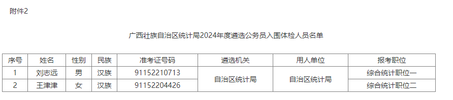 2.廣西壯族自治區(qū)統(tǒng)計(jì)局2024年度公開遴選公務(wù)員入圍體檢人員名單