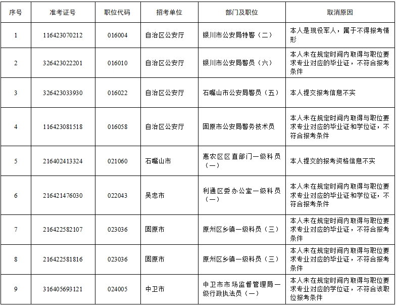 根據(jù)《寧夏回族自治區(qū)2024年考試錄用公務(wù)員公告》相關(guān)規(guī)定,自治區(qū)公務(wù)員局會(huì)同有關(guān)部門及各招錄機(jī)關(guān)對(duì)2024年全區(qū)考試錄用公務(wù)員擬進(jìn)入面試的報(bào)考者進(jìn)行了資格復(fù)審。復(fù)審中發(fā)現(xiàn),部分報(bào)考者不符合職位資格條件,部分報(bào)考者放棄面試資格,個(gè)別職位達(dá)不到面試開考比例。經(jīng)自治區(qū)公務(wù)員主管部門研究,決定取消部分報(bào)考者面試資格,降低部分職位面試開考比例?,F(xiàn)將有關(guān)情況公告如下: