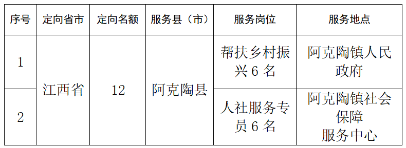 為貫徹落實黨中央、國務院和自治區(qū)黨委、人民政府關于進一步引導鼓勵高校畢業(yè)生到基層就業(yè)的決策部署,根據(jù)自治區(qū)人力資源和社會保障廳、財政廳《關于做好2024年自治區(qū)高校畢業(yè)生“三支一扶”計劃實施工作的通知》(新人社函〔2024〕123號)精神,結合克州實際,現(xiàn)將2024年克州面向江西省定向招募高校畢業(yè)生“三支一扶”計劃公告如下: