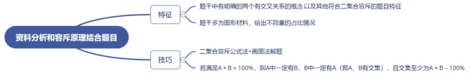 一般情況下,題干會(huì)涉及到兩個(gè)概念,通過(guò)題干判斷兩個(gè)概念是否有交叉關(guān)系,再看題目問(wèn)法,如滿足容斥原理題目問(wèn)法時(shí),可以直接帶公式進(jìn)行計(jì)算。