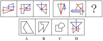 【答案】D【解析】第一步,觀察特征。組成元素不同,優(yōu)先考慮數(shù)量類或?qū)傩灶?,每幅圖形均由兩個對稱圖形組成,考慮對稱性。第二步,兩段式,第一段找規(guī)律,第二段應用規(guī)律。第一段,每幅圖中兩個圖形對稱軸的夾角分別為0°、45°、90°;第二段應用此規(guī)律,前兩幅圖形中兩個圖形對稱軸夾角分別為0°、45°,所以問號處應為90°,如下圖所示,只有D項符合。