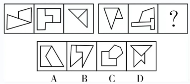 【答案】C【解析】第一步,觀察特征。組成元素不同,優(yōu)先考慮屬性類或數(shù)量類。對稱特征明顯,考慮屬性類對稱性。第二步,兩段式,第一段找規(guī)律,第二段應用規(guī)律。第一段三個圖形均為軸對稱圖形,對稱軸方向分別為:橫軸、斜軸(\)、豎軸,即對稱軸依次順時針旋轉(zhuǎn)45°;第二段應用規(guī)律,前兩圖的對稱軸方向為斜軸(\)、豎軸,問號處應為斜軸(/),只有C項符合。因此,選擇C選項。