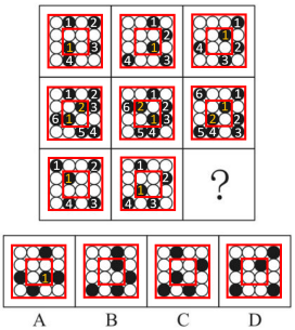 第一、二、三行內(nèi)圈黑點(diǎn)均依次逆時(shí)針移動(dòng)一格,第三行第二個(gè)圖形內(nèi)圈的黑點(diǎn)位于左下角,逆時(shí)針移動(dòng)一格應(yīng)該在右下角,只有A項(xiàng)符合,故答案為A。(時(shí)間充足的情況下可以再驗(yàn)證一下外圈的移動(dòng)規(guī)律。)