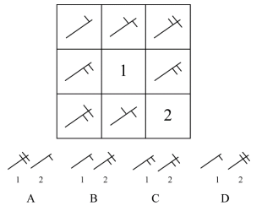 例2:從所給四個(gè)選項(xiàng)中,選擇最合適的填入1和2處,使之呈現(xiàn)一定的規(guī)律性:( )