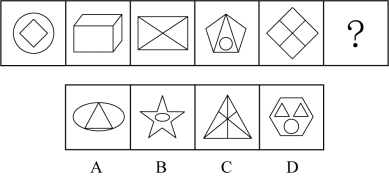 元素組成混亂,但題干與選項(xiàng)中每個(gè)圖形均出現(xiàn)了圓,優(yōu)先考慮圓內(nèi)外數(shù)量關(guān)系。圓內(nèi)點(diǎn)的數(shù)量分別為0,1,2,3,4,因此問號(hào)中圖形圓內(nèi)交點(diǎn)數(shù)量應(yīng)該為5,觀察四個(gè)選項(xiàng),圓內(nèi)交點(diǎn)數(shù)分別為4,2,5,8,只有C項(xiàng)符合,故答案為C。
