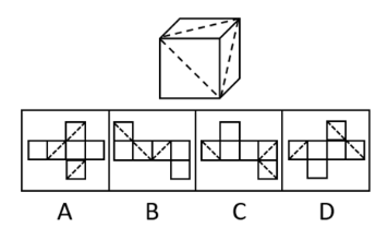 例1:本題考查六面體。觀察題干立體圖形,三個(gè)斜線面為相鄰面,而A項(xiàng)中有兩個(gè)斜線面為相對(duì)面,即不可能是所給立方體展開圖。本題為選非題,故答案為A。
