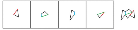 下邊四個(gè)圖形中,只有一個(gè)是由上邊的四個(gè)圖形拼合(只能通過上、下、左、右平移)而成的,請(qǐng)把它找出來。