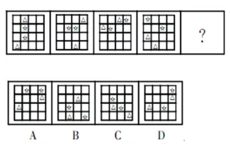 分別來看,所有三角形都分布在表格的邊界上,所有的星星都在對角線上,這樣就找到了圖形組成元素在位置分布上的規(guī)律,結(jié)合選項,符合這個規(guī)律的只有D項。