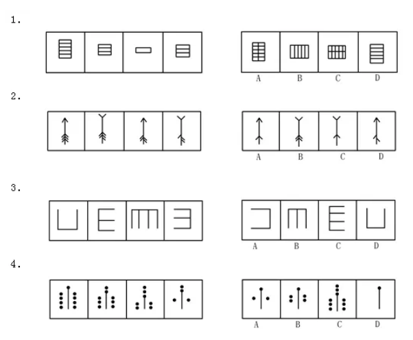 做圖形推理題的關(guān)鍵就在于找出第一套圖形中的規(guī)律。找到規(guī)律以后就可以很容易地把它運用到第二套圖形中去。要找到其規(guī)律,觀察圖形的要點有:圖形的大小、筆畫曲直多少、方向的旋轉(zhuǎn)、圖形的組合順序、圖形的疊加、求同等等。