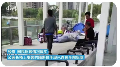 某地公園為防止日結(jié)工在長(zhǎng)椅上過夜影響市容而焊上隔斷鋼管,這一做法實(shí)在是欠妥。