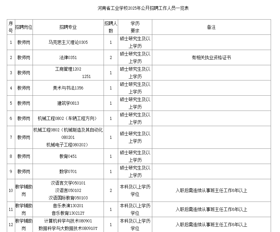 7.崗位所需的學(xué)歷、專業(yè)和其他條件(詳見附件《河南省工業(yè)學(xué)校2025年公開招聘工作人員一覽表》);