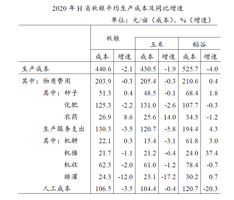 2020年,H省秋糧玉米和稻谷的市場平均交易價(jià)格分別為2.34元/公斤和2.74元/公斤,分別比上年上漲28.6%和8.7%。按此價(jià)格測算,2020年全省農(nóng)戶種植玉米、稻谷扣除成本前的產(chǎn)值分別為957.1元/畝、1520.7元/畝,分別比上年增長33.4%、8.9%。