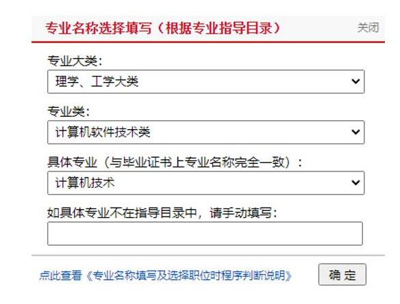 專業(yè)名稱填寫使用分級(jí)下拉框方式,先選擇專業(yè)大類,再選擇專業(yè)類,最后選擇具體專業(yè)。如具體專業(yè)不在選項(xiàng)中,請(qǐng)手動(dòng)填寫具體專業(yè)名稱。