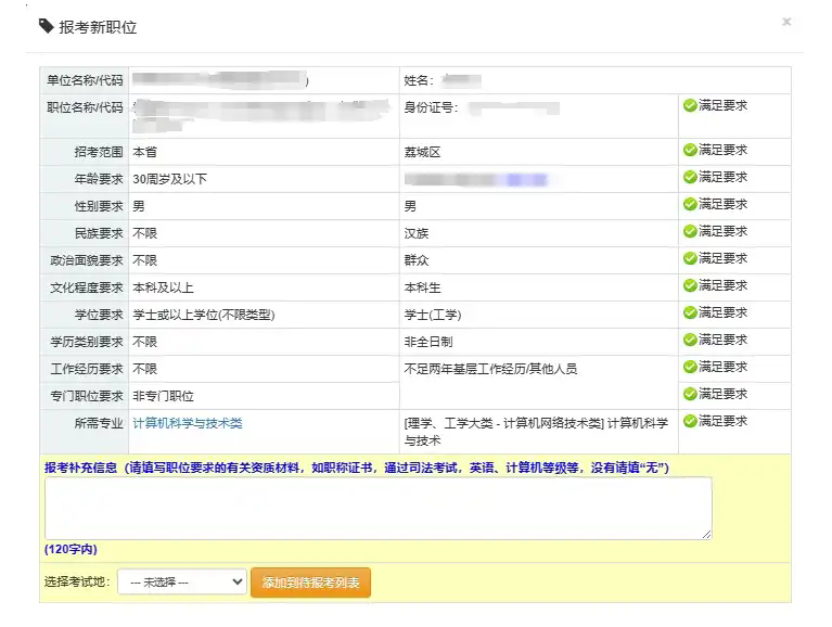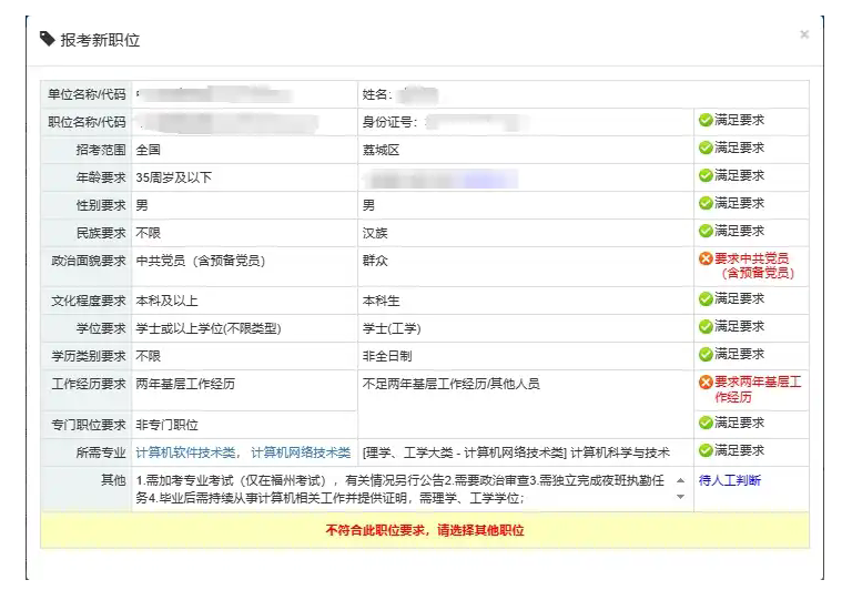 如果不滿足職位要求,報(bào)名系統(tǒng)會(huì)提示具體原因。