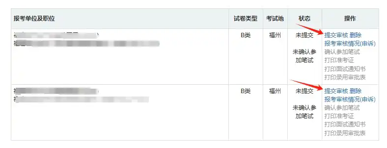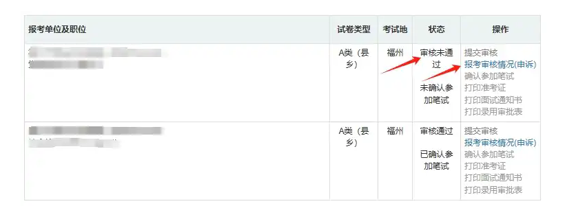審核未通過(guò)的職位,報(bào)考者可點(diǎn)擊“職位列表”中的“報(bào)考審核情況(申訴)”按鈕查看審核意見(jiàn)。