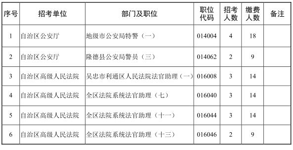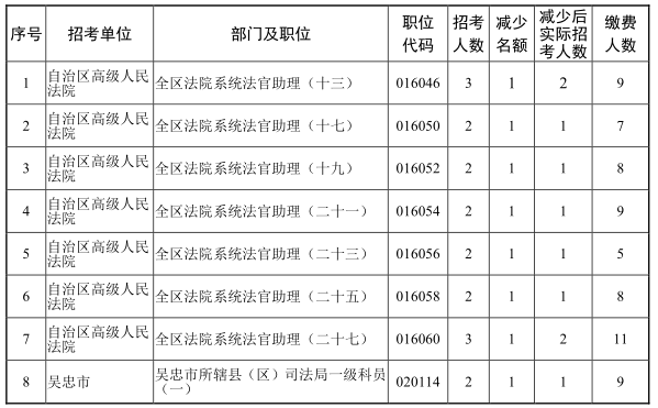 2025年全區(qū)考試錄用公務(wù)員網(wǎng)上報名、資格初審及繳費工作結(jié)束后,有部分職位未達(dá)到筆試開考比例。根據(jù)《寧夏回族自治區(qū)2025年考試錄用公務(wù)員公告》中“筆試開考比例(職位有效報名人數(shù)與招錄名額之比)一般為5: 1。定向招考職位、專業(yè)性較強、生源較少的職位以及艱苦邊遠(yuǎn)地區(qū)招考職位筆試開考比例可降至3:1。公安系統(tǒng)法醫(yī)、特殊緊缺人才職位,監(jiān)獄機關(guān)獄醫(yī)等專業(yè)性強的職位筆試開考比例可降至2:1。達(dá)不到筆試開考比例的職位,減少招考名額或取消招考計劃。招考計劃取消的,報考該職位的考生可改報其他符合條件的職位”的規(guī)定,經(jīng)研究,取消部分職位招考計劃、減少部分職位招考名額、降低部分職位筆試開考比例。具體如下: