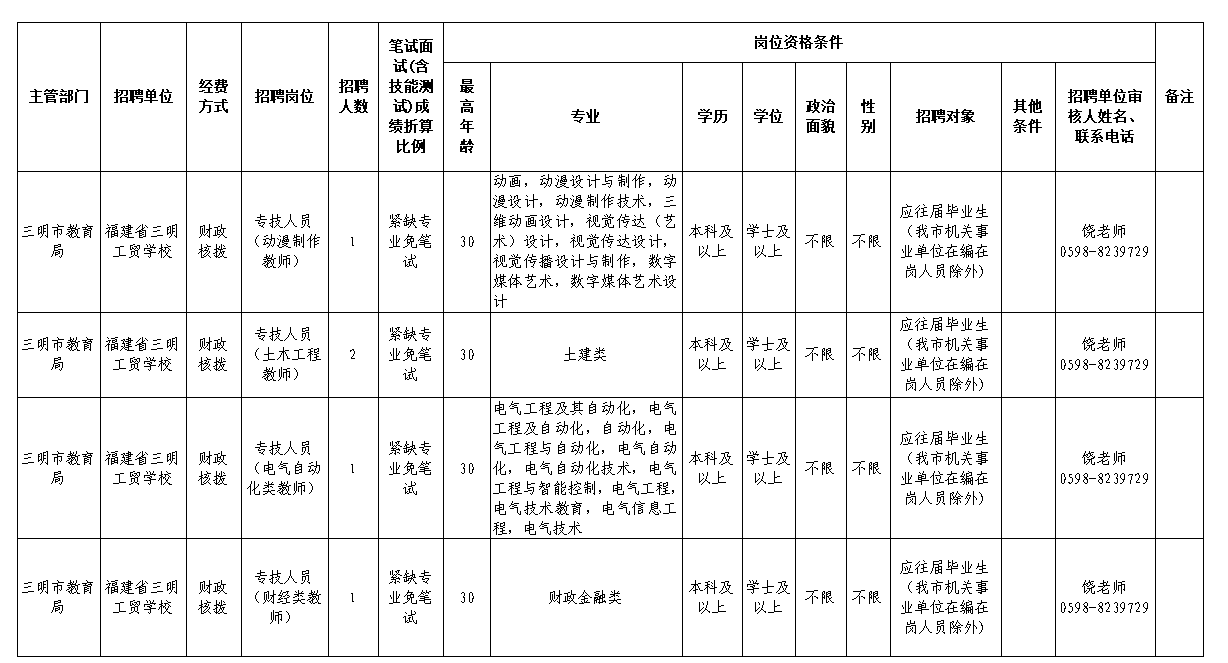 三明市教育局關(guān)于三明工貿(mào)學校2025年招聘緊缺急需專業(yè)工作人員的通告