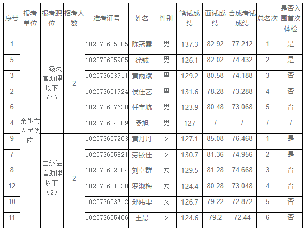 余姚市2025年公務(wù)員考試法官助理職位面試成績、合成總成績的公告