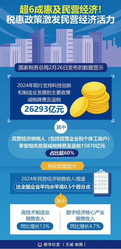 黨的十八大以來,各地區(qū)各部門從減稅降費(fèi)、市場(chǎng)準(zhǔn)入、融資支持等方面出臺(tái)系列政策舉措,有力促進(jìn)民營(yíng)經(jīng)濟(jì)發(fā)展壯大。根據(jù)國(guó)家稅務(wù)總局2025年2月26日發(fā)布的數(shù)據(jù),2024年現(xiàn)行支持科技創(chuàng)新和制造業(yè)發(fā)展的稅惠政策超六成惠及民營(yíng)經(jīng)濟(jì)。新華社發(fā) 王威/制圖