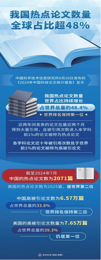 中國科學(xué)技術(shù)信息研究所2024年9月20日發(fā)布的《2024年中國科技論文統(tǒng)計(jì)報(bào)告》顯示,截至2024年7月,我國熱點(diǎn)論文數(shù)量世界占比持續(xù)增長,占世界總量的48.4%,世界排名保持第一位;高被引論文數(shù)量保持世界第二位。新華社發(fā)程碩/制圖