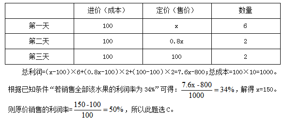 例2:超市銷售某種水果,第一天按原價(jià)售出總量的60%,第二天原價(jià)打八折售出剩下的一半,第三天按成本價(jià)全部售出。若銷售全部該水果的利潤(rùn)率為34%,則該水果按原價(jià)銷售的利潤(rùn)率為:( )