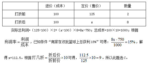 【答案】C【解析】觀察條件,發(fā)現(xiàn)已知條件均為相對(duì)數(shù),所求仍為相對(duì)數(shù),符合特值法應(yīng)用條件。不妨假設(shè)定價(jià)100元,總購(gòu)進(jìn)數(shù)量為10個(gè)。打折后促銷價(jià)為x元。