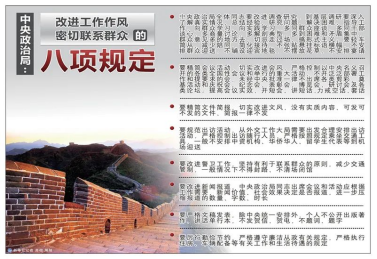 2012年12月4日,中共中央政治局審議通過關于改進工作作風、密切聯(lián)系群眾的八項規(guī)定。圖表為中央八項規(guī)定內容。新華社記者高微/編制??