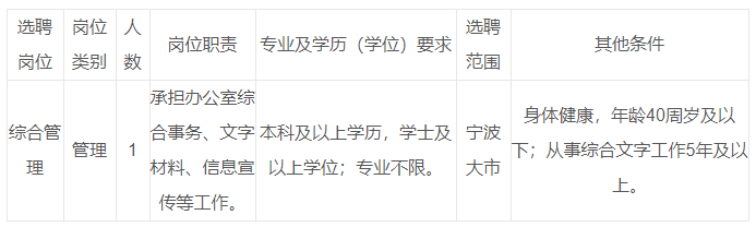 根據(jù)《關(guān)于進一步規(guī)范事業(yè)單位工作人員交流的通知》(浙人社〔2018〕24號)《寧波市事業(yè)單位工作人員交流辦法(試行)》(甬人社發(fā)〔2020〕28號)等有關(guān)規(guī)定,寧波市機關(guān)事務(wù)管理局直屬事業(yè)單位寧波市市級機關(guān)后勤服務(wù) 中心擬面向全市公開選聘事業(yè)編制人員1名。