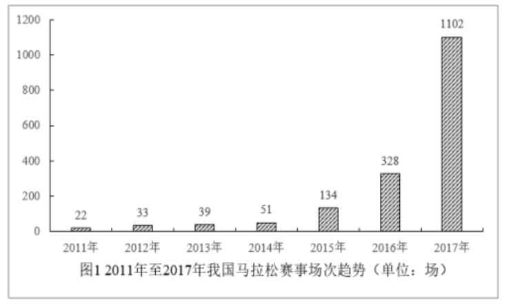 2017年全國舉辦馬拉松賽事達1102場,其中,中國田徑協(xié)會舉辦的A類賽事223場,B類賽事33場。2017年馬拉松賽事的參與人次達到了498萬人次,2016年、2015年馬拉松賽事的參與人次分別為280萬人次、150萬人次。