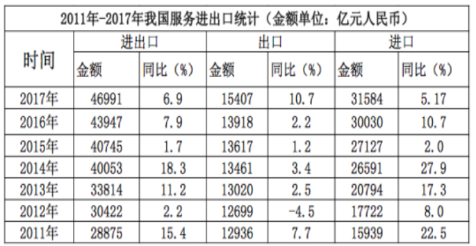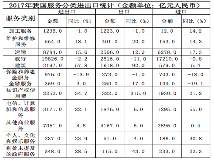 D.2017年我國服務(wù)進出口中,別處未提及的政府服務(wù)進出口占比最小