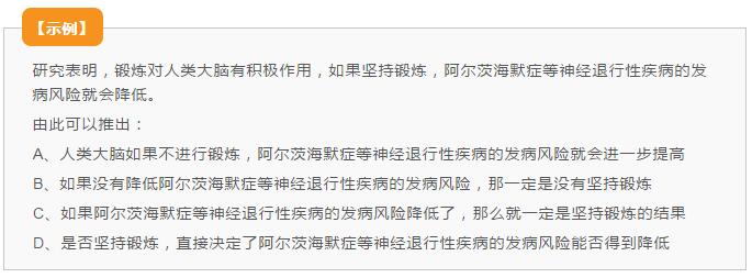 分析選項(xiàng):A項(xiàng),“不進(jìn)行鍛煉”是對(duì)①的“否前”,排除;C項(xiàng),“阿爾茨海默癥等神經(jīng)退行性疾病的發(fā)病風(fēng)險(xiǎn)降低了”是對(duì)①的“肯后”,排除;D項(xiàng),“直接決定了”表述過(guò)于絕對(duì),說(shuō)法有誤,排除;B項(xiàng),“沒(méi)有降低阿爾茨海默癥等神經(jīng)退行性疾病的發(fā)病風(fēng)險(xiǎn)”是對(duì)①的“否后”,根據(jù)“否后必否前”,該項(xiàng)可推出。