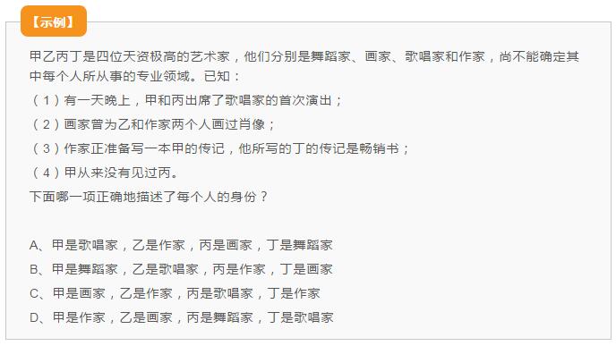 【點(diǎn)撥】由條件(1)可知:甲和丙都不是歌唱家,排除選項(xiàng)A、C;由條件(2)可知:乙不是畫(huà)家,排除選項(xiàng)D。故答案為B。