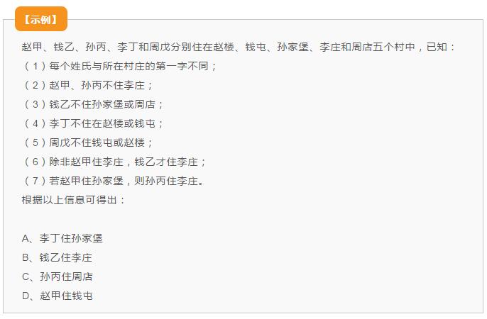 【解析】根據(jù)條件(2)甲不住李莊且丙不住李莊,結(jié)合條件(6)和(7)可知,乙不住在李莊,甲不住在孫家堡。此時(shí),由因?yàn)槊總€(gè)人的姓氏與村莊第一個(gè)字不同,所以丁也不住李莊,只能戊住在李莊,排除B項(xiàng);