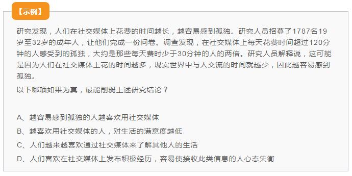 A項(xiàng),指出越容易感到孤獨(dú)的人越喜歡用社交媒體,說(shuō)明并不是因?yàn)樵谏缃幻襟w上花費(fèi)的時(shí)間越長(zhǎng)才越容易感到孤獨(dú),而是因?yàn)楸旧砉陋?dú)才會(huì)去使用社交媒體,屬于因果倒置的削弱項(xiàng),削弱了題干結(jié)論,并且因果倒置的削弱力度很強(qiáng),因此可以直接選擇A。
