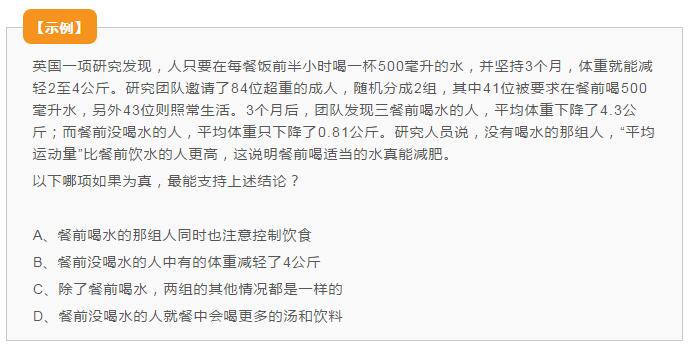 【點(diǎn)撥】題干內(nèi)容為通過(guò)兩組不同人員的對(duì)照試驗(yàn),去研究餐前喝水與減肥之間的關(guān)系,考查對(duì)比實(shí)驗(yàn)。為確保實(shí)驗(yàn)結(jié)果的有效性,通常只能設(shè)置一個(gè)變量,其他因素應(yīng)該保持一樣。C項(xiàng)說(shuō)明兩組對(duì)象其他條件一致,即排除了其他因素的影響,確保了實(shí)驗(yàn)的有效,支持了題干結(jié)論,當(dāng)選。而A項(xiàng)則說(shuō)明可是能控制飲食這個(gè)原因?qū)е虏颓昂人娜梭w重下降得更多,屬于另有他因,削弱了題干,為削弱項(xiàng)。