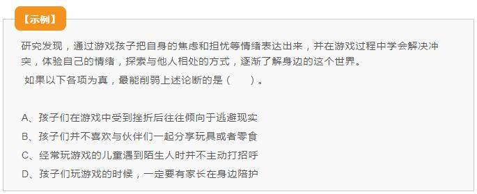 【點(diǎn)撥】題干結(jié)論是孩子通過(guò)游戲可以把自己的情緒表達(dá)出來(lái),解決矛盾沖突,學(xué)會(huì)與他人相處,并了解身邊的世界。A項(xiàng)指出孩子在游戲中受挫后會(huì)逃避現(xiàn)實(shí),說(shuō)明通過(guò)游戲不能起到解決沖突,了解世界的作用,直接削弱了題干結(jié)論,當(dāng)選。B和D都是不能削弱的,C的選項(xiàng)不打招呼并不一定就是由于游戲的原因,可能是孩子本身就很自閉內(nèi)向。