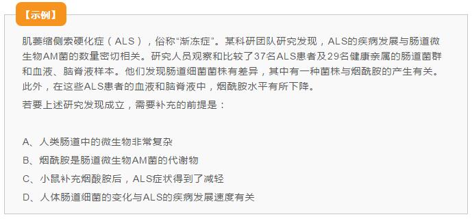 論證分析:從前提中的概念“煙酰胺”到結(jié)論中的概念“AM菌”,出現(xiàn)了明顯的跳躍,補(bǔ)充前提考慮在這兩個(gè)跳躍概念之間搭橋。