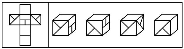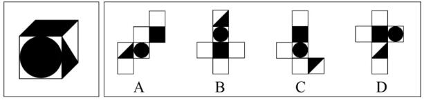 第二種是給一個(gè)立體圖形,問(wèn)右邊哪個(gè)平面展開(kāi)圖是可以由左邊的立體圖形拆開(kāi)后形成,俗稱(chēng)拆紙盒(圖2)。無(wú)論是題目難度還是考查頻率,折紙盒都遠(yuǎn)遠(yuǎn)高于拆紙盒。