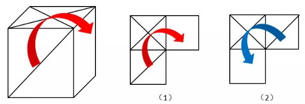 所謂時(shí)針?lè)?,就是利用各個(gè)面展開(kāi)、折疊后相對(duì)位置不發(fā)生變化的特性,在三個(gè)相鄰面上畫(huà)時(shí)針。畫(huà)時(shí)針的時(shí)候要注意確定好起點(diǎn)面、路徑面和終點(diǎn)面,當(dāng)題干與選項(xiàng)的時(shí)針?lè)较虿灰恢聲r(shí),即為錯(cuò)誤選項(xiàng)。例如圖4,原圖中以斜線(xiàn)面為起點(diǎn)、X面為路徑、空白面為終點(diǎn),所畫(huà)時(shí)針為順時(shí)針,而以同樣的方式畫(huà)時(shí)針,(1)為順時(shí)針、(2)為逆時(shí)針,則(2)一定為錯(cuò)誤選項(xiàng)。