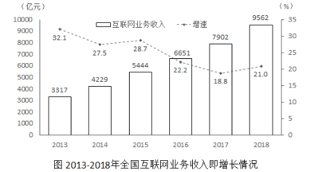 2018年全國互聯(lián)網(wǎng)業(yè)務(wù)收入9562億元,比上年增長21.0%。其中,廣東、上海、北京互聯(lián)網(wǎng)業(yè)務(wù)收入分別增長26.5%、20.0%和25.2%。2018年互聯(lián)網(wǎng)企業(yè)信息服務(wù)收入8594億元,比上年增長20.7%。其中,電子商務(wù)平臺收入3667億元,增長13.1%;網(wǎng)絡(luò)游戲業(yè)務(wù)收入1948億元,增長17.8%。2018年互聯(lián)網(wǎng)行業(yè)研發(fā)投入490億元,比上年增長19.0%。