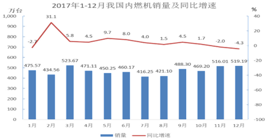 2017年1~12月,全國(guó)內(nèi)燃機(jī)累計(jì)銷(xiāo)量5645.38萬(wàn)臺(tái),同比增長(zhǎng)4.11%,累計(jì)完成功率266879.47萬(wàn)千瓦,同比增長(zhǎng)9.15%,其中柴油內(nèi)燃機(jī)功率同比增長(zhǎng)34%。